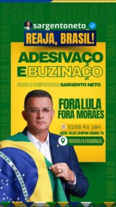 Na oportunidade, o movimento intitulado ‘Reaja, Brasil’, vai promover um adesivaço um buzinaço para pedir ‘Fora Lula’ e ‘Fora Moraes’.