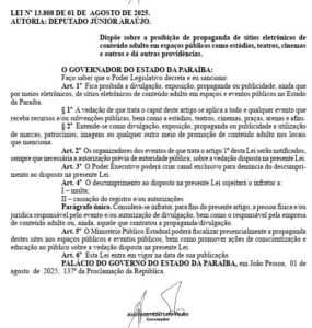 Foi sancionada na última sexta (1/8) a Lei nº 13.808/2025, de autoria do deputado estadual Júnior Araújo (PSB), que proíbe a divulgação de propaganda de sites eletrônicos com conteúdo adulto em espaços e eventos públicos na Paraíba. A medida, já em vigor, vale para locais como estádios, teatros, cinemas, praças e arenas que recebam recursos públicos ou subvenções do Estado.